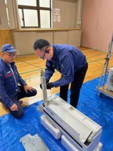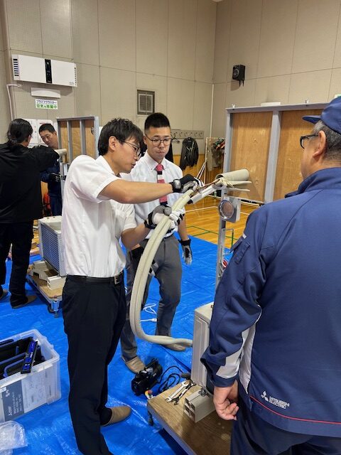 当社では、これまでにも各メーカー様に講師をお願いし、様々な機器の仕組みや、さらにその基礎となる電気の知識等を新人職員が学べる機会を設けてきました。その中でも、今回の研修では三菱電機住環境システムズ様にご協力をいただきながら、広い研修場所で実際にエアコンにふれながら、機器の仕組みや施工の手順・注意点等を学ぶという体験スタイルでの学習活動が行われました。